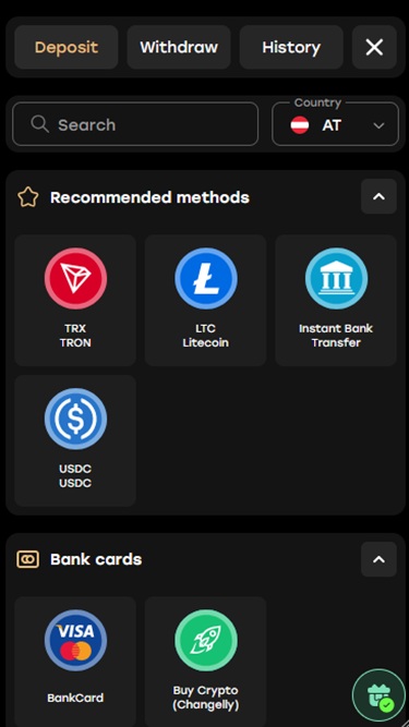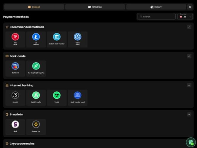 Este é um site de jogos que, como já mencionamos, oferece diversas opções de pagamento com criptomoedas para depósitos e saques . Outros métodos bancários confiáveis e populares, como cartões de pagamento e carteiras eletrônicas, também estão disponíveis.