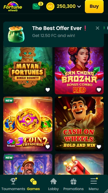 Os torneios são outra parte essencial do Fortune Wheelz Casino. Se você é o tipo de jogador que gosta de competições e eventos voltados para a comunidade, provavelmente vai curtir todos os torneios de caça-níqueis que a marca organiza regularmente. Você pode participar tanto no modo Moedas de Ouro quanto no modo Moedas da Fortuna.