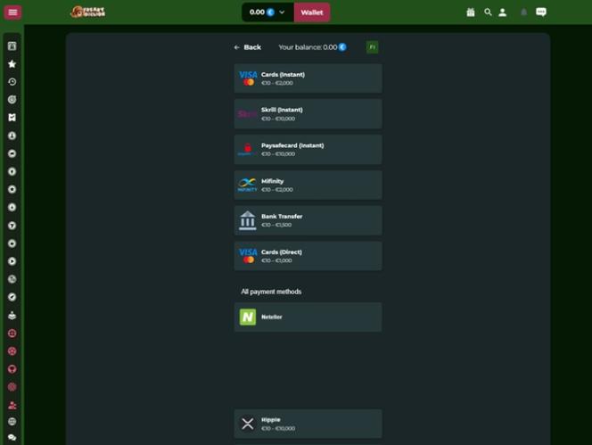 Atualmente, dentro do repertório bancário, os jogadores poderão utilizar soluções como Bitcoin, Bitcoin Cash, Litecoin, Ripple, Tether, Tron e USD Coin, além da possibilidade de realizar operações de pagamento por meio de algumas das opções mais comuns, como transferência bancária, Visa, Skrill e MiFinity, entre outras.