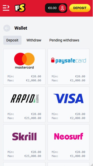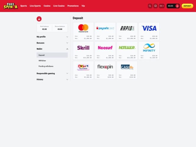 O Free Spinza oferece aos jogadores diversos métodos de pagamento para gerenciar seus fundos no cassino. Você pode depositar e sacar fundos usando Visa , Mastercard , Skrill , MiFinity, Neosurf, Neteller , transferência bancária , Nordea e AstroPay.