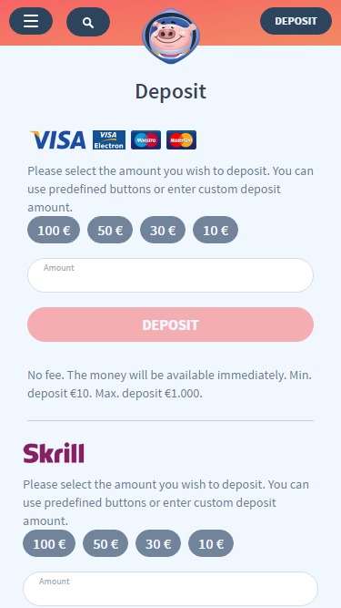 O depósito mínimo é de 10 euros e o saque mínimo é de 5 euros! Isso acontece muito raramente. Não foi nada agradável que, se você receber um bônus, ele não apareça na sua conta imediatamente, aparecendo somente após o cumprimento dos requisitos de aposta. Mas você pode sacar seu dinheiro a qualquer momento. Cassino normal e interessante.