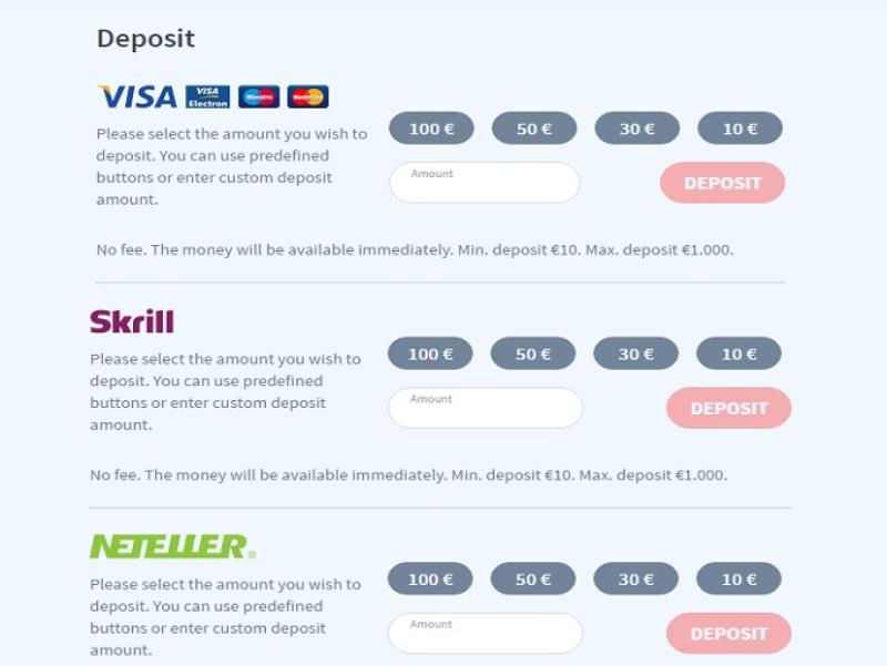 O depósito mínimo é de 10 euros e o saque mínimo é de 5 euros! Isso acontece muito raramente. Não foi nada agradável que, se você receber um bônus, ele não apareça na sua conta imediatamente, aparecendo somente após o cumprimento dos requisitos de aposta. Mas você pode sacar seu dinheiro a qualquer momento.