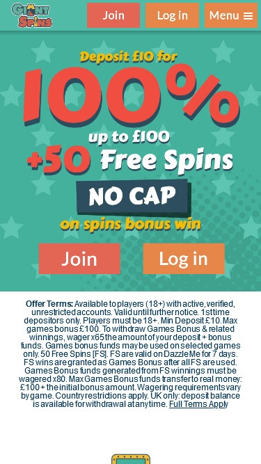 O Giant Spins Casino é um site de apostas online fundado em 2018 e operado pela Cassava Enterprises. Se o site lhe parece familiar, há um motivo. Inicialmente chamado Winneroo, foi renomeado para Crystal Spins em 2018 e, no mesmo ano, para Giant Spins. O resultado é um site praticamente idêntico aos outros dois. Isso significa que você encontrará um programa VIP decente, boa compatibilidade com dispositivos móveis e jogos justos com certificação eCOGRA.