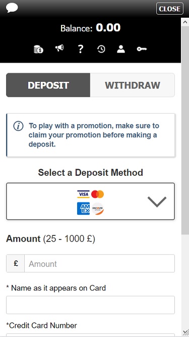 Nunca encontrei uma maneira de depositar aqui e duvido que consiga, porque todo o site, da página inicial ao índice, está muito desatualizado e simplesmente não me atrai como jogador – todos os jogos incluídos. Joguei com bônus sem depósito, mas não tentei ganhar nada porque sabia que exigiriam um depósito para sacar, e parecia muito trabalhoso para um site que eu sabia que não usaria sem uma grande atualização.