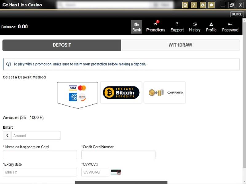No Golden Lion Casino, os jogadores podem depositar fundos via transferência bancária, Neteller, Skrill, PaySafeCard, Visa e MasterCard. Os saques são feitos por transferência bancária, Skrill, Moneybookers e Neteller. O tempo de processamento dos pagamentos não é o mais rápido do mundo, mas é certamente aceitável, especialmente para um cassino que aceita jogadores dos EUA. Se você tiver um saldo alto, observe que o Golden Lion Casino tem um limite de saque de US$ 3.000 por semana, o que significa que, se você ganhar muito, poderá ter que esperar um pouco para receber todo o seu dinheiro.