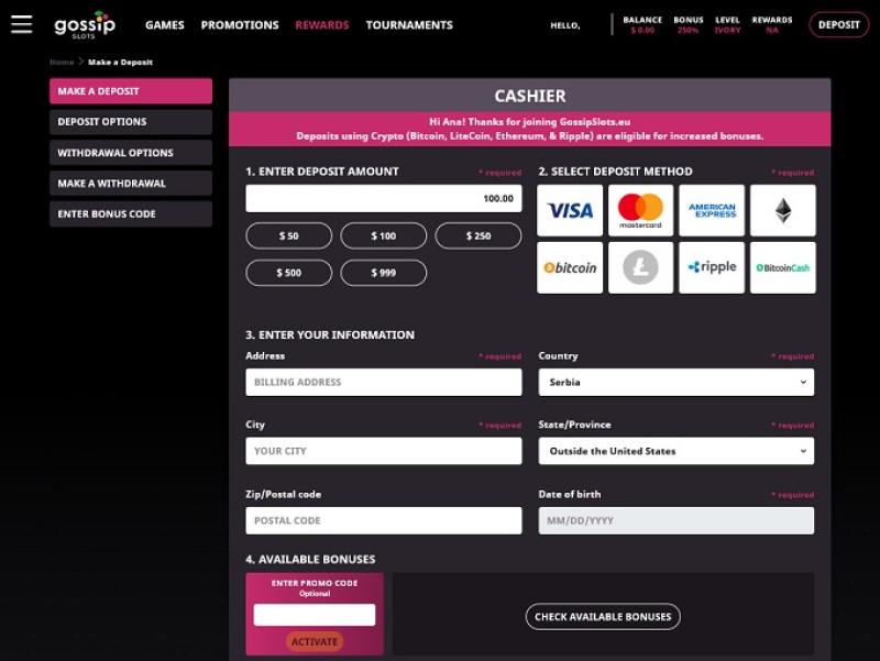 Além de jogos de mesa, caça-níqueis e videopôquer, o Gossip Slots oferece aos seus jogadores raspadinhas, keno e jogos de corrida virtuais.