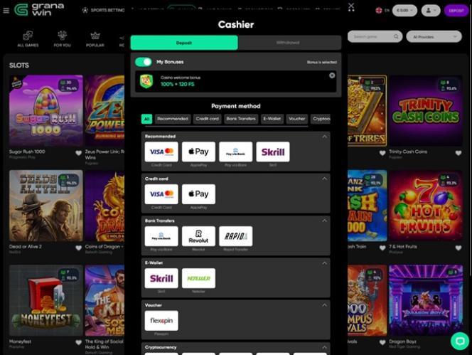 O GranaWin é um cassino online que aceita uma infinidade de métodos de pagamento diferentes, incluindo opções muito populares como Visa , Mastercard , transferência bancária, Skrill , Neteller , Apple Pay, Revolut e Flexepin . Além disso, os jogadores podem depositar e sacar fundos usando diversas criptomoedas, incluindo Bitcoin , Cardano , Dogecoin , Litecoin , Ethereum, Solana, Tether e Ripple .