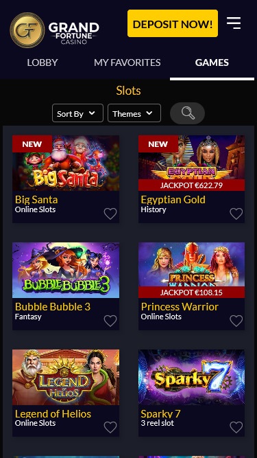O Grand Fortune Casino oferece dezenas de caça-níqueis em vídeo, além de alguns jogos clássicos. Há também diversos jackpots disponíveis, com prêmios que variam de algumas centenas a mais de um milhão de dólares.
