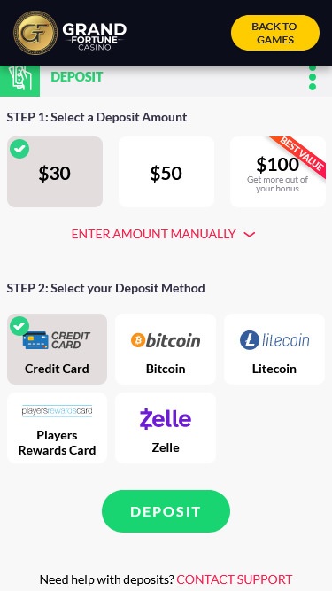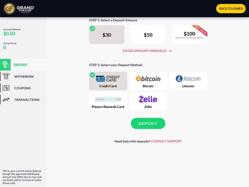 No Grand Fortune Casino, os jogadores ganham 1 ponto de fidelidade para cada £10 apostados no cassino, e 100 pontos podem ser trocados por £1 em dinheiro no cassino.