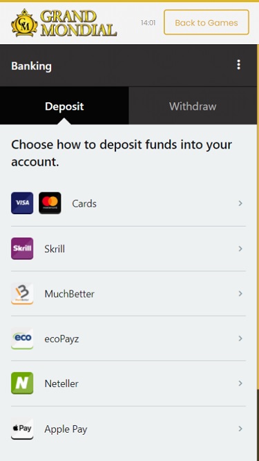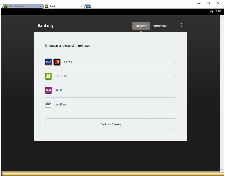 O Grand Mondial Casino é operado pela Microgaming, Rabcat, Triple Edge Studios, Northern Lights Gaming, Stormcraft Studios, Switch Studios, Electric Elephant Games, All41 Studios, Gameburger Studios, Pulse 8 Studios, Neon Valley Studios, SpinPlay Games, Real Dealer Studios, GONG Gaming, On Air Entertainment, Buck Stakes Entertainment, Games Global, Old Skool Studios, Foxium, Just For The Win, PearFiction Studios, Slingshot Studios, Fortune Factory Studios, Crazy Tooth Studio, Alchemy Gaming, Snowborn Games, Gold Coin Studios, Half Pixel Studios, Eurostar Studios and Aurum Signature Studios , que oferece centenas de jogos através de um software cliente baseado na web e para download. Os jogadores também encontrarão uma opção de apostas móveis, que pode ser usada em smartphones e tablets.Blackjack