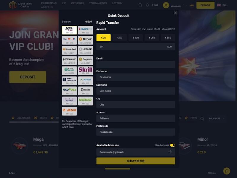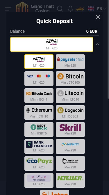 Insistimos que você leia o restante por conta própria para que possa conhecer todas as condições necessárias. Quanto às opções bancárias, o Grand Thef Casino oferece aos jogadores a possibilidade de pagar com criptomoedas, caso seja essa a sua preferência. Além dessas opções, os jogadores podem optar por pagar com algumas das opções mais populares, como Visa, MasterCard, Neosurf, Neteller, PaysafeCard e muitas outras. Os jogadores também podem optar por fazer depósitos com Skrill, se assim desejarem.