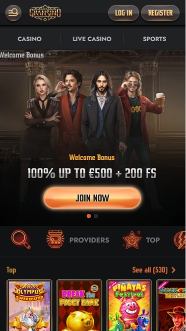 À primeira vista, a impressão é de que o cassino oferece uma atmosfera realmente agradável. Os jogadores que apreciam música irão desfrutar especialmente deste cassino online, já que esse é o tema principal do Gransino. A página inicial apresenta gráficos e detalhes belamente elaborados que os jogadores certamente irão apreciar. Além de ícones interessantes, também há banners e slides promocionais, bem como diversas páginas e seções úteis sobre as ofertas do cassino. Recomendamos que todos os visitantes consultem a seção de rodapé, onde podem encontrar informações sobre promoções do cassino , torneios, desafios semanais, o programa de fidelidade do cassino, opções de pagamento e muito mais.