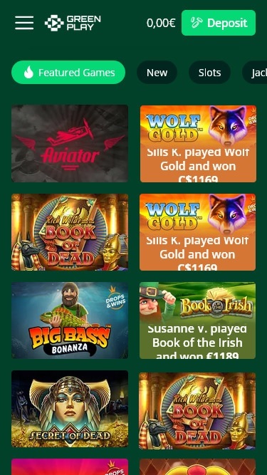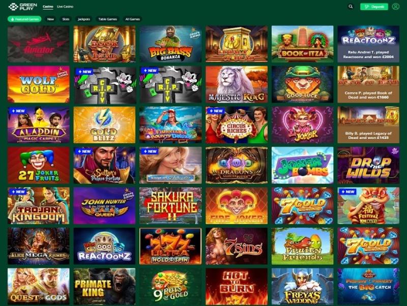 As categorias de jogos da Greenplay são: Jogos em Destaque, Novidades, Caça-níqueis, Jackpots, Jogos de Mesa e Todos os Jogos.