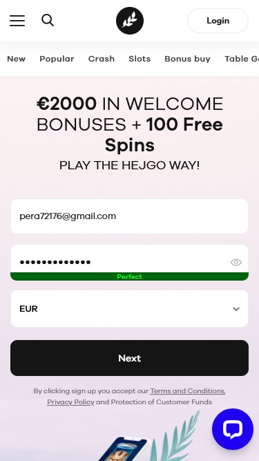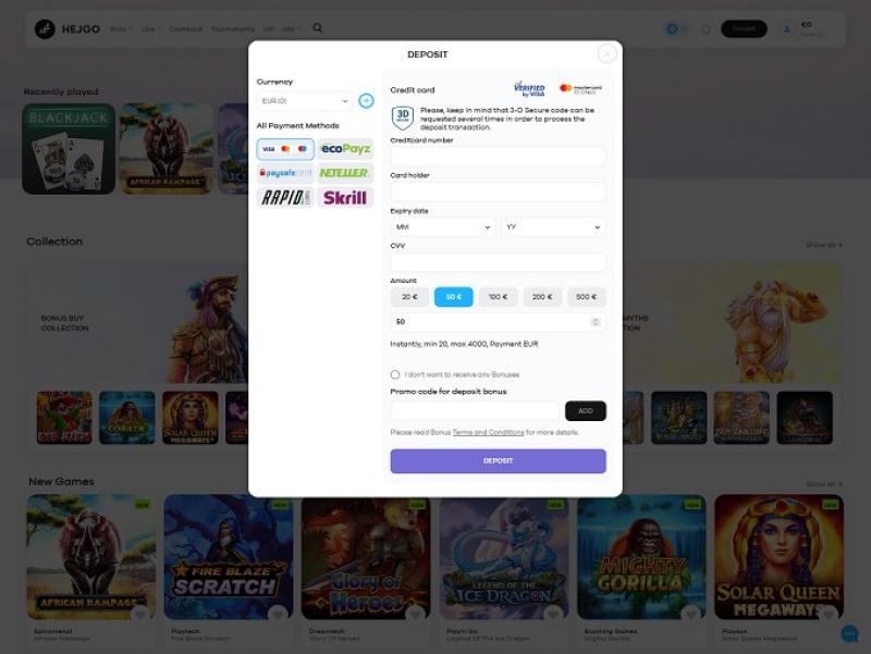 O processo de cadastro é rápido e fácil. As janelas pop-up guiam os novos usuários por todo o procedimento de inscrição. Parece que não levamos quase nenhum tempo para concluir o cadastro no Hejgo e, ao final desse procedimento simples, nos foi oferecido a opção de resgatar um código de bônus e fazer um depósito. Essa opção é muito útil para todos nós que estamos ansiosos para experimentar os jogos.