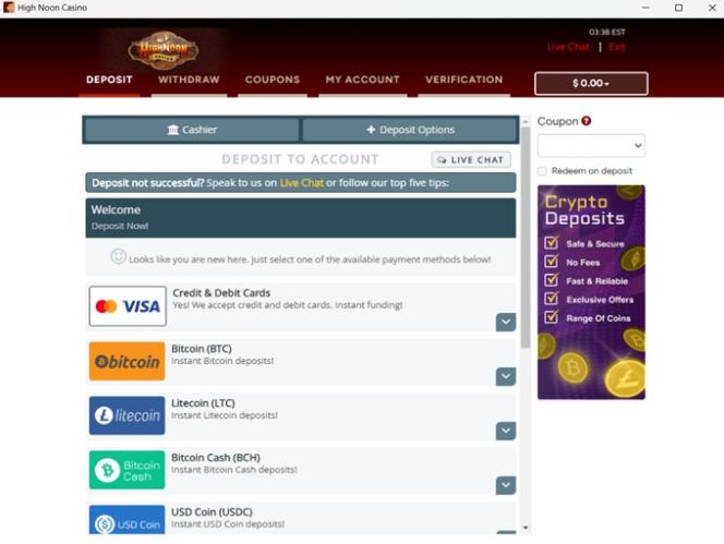Considerando que o High Noon Casino atende principalmente o mercado de apostas americano, seria compreensível pensar que seu sistema bancário é lento, com pagamentos demorados e opções limitadas. No entanto, esse não é o caso, já que o cassino aceita depósitos e saques via cartão de crédito, carteira eletrônica e transferência bancária. A velocidade de processamento também é boa, com os jogadores podendo receber seus pagamentos em cerca de 5 dias úteis.