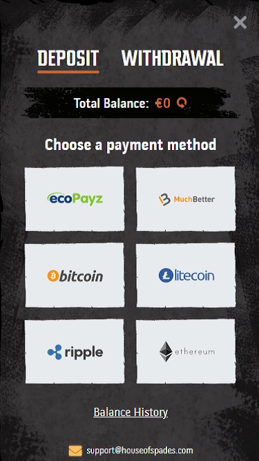 Embora o sistema de caixa do cassino House Of Spades varie de acordo com o país, ele oferece suporte a vários métodos de pagamento, incluindo opções bancárias com criptomoedas, independentemente da jurisdição de jogos de azar de onde você esteja.