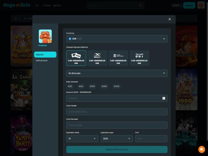 Para depositar e sacar fundos da sua conta de cassino, o HugoBets oferece diversos métodos de pagamento, incluindo Visa , Mastercard, transferência bancária , Neteller, MiFinity , Google Pay e Skrill . Além disso, os jogadores podem gerenciar seus fundos usando várias criptomoedas, como Bitcoin , Cardano, Dogecoin, Ethereum , Solana, Tron , Tether e Ripple .