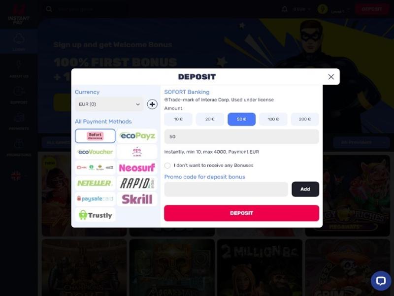 O InstantPay Casino é um site de apostas online operado pela N1 Interactive Limited, licenciada pela Malta Gaming Authority. O site se especializa em oferecer pagamentos instantâneos aos jogadores e conta com uma biblioteca de jogos impressionante, além de um excelente programa de fidelidade. Em resumo? Jogar aqui é uma ótima opção para quem busca um site que faça quase tudo da maneira correta.Informações do cassino