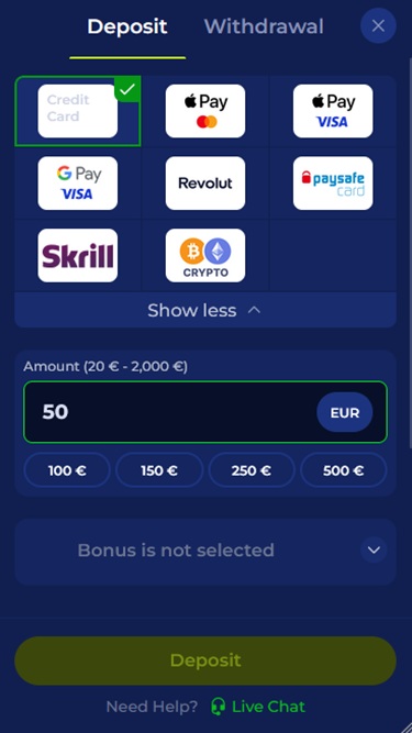 Para depositar e sacar fundos da sua conta no cassino, você poderá utilizar diversos métodos de pagamento no Ivybet Casino, incluindo Visa , Mastercard , Apple Pay, transferência bancária , Google Pay , Revolut, Neosurf e Paysafecard . A marca também aceita diversas criptomoedas, como Bitcoin , Bitcoin Cash, Dogecoin, Ethereum, Litecoin, USD Coin, Tether e Tron .