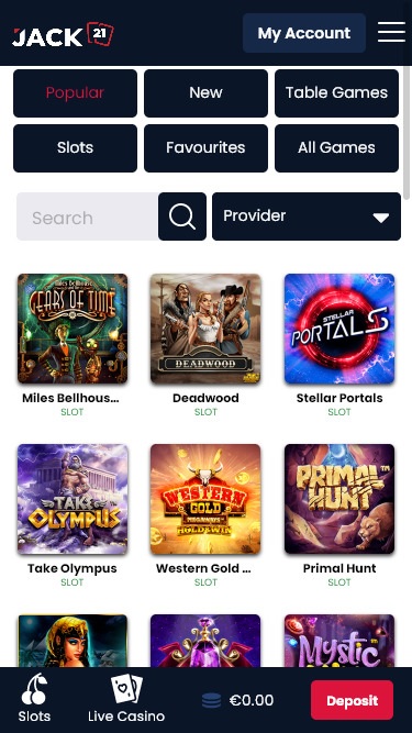 O Jack21 Casino é operado pela Microgaming, Net Entertainment, BetSoft, 1x2gaming, Big Time Gaming, ELK Studios, Evolution Gaming, Ezugi, Genesis Gaming, Habanero Systems, iSoftBet, Oryx, Play'n GO, playson, Quickspin, Rabcat, Relax Gaming, Thunderkick, Vivo Gaming, Yggdrasil, Endorphina, Wazdan, GameArt, Betgames, Booming Games, Pragmatic Play, Nolimit City, Red Tiger Gaming, Spinomenal, Fugaso, Kalamba, Triple Edge Studios, Northern Lights Gaming, Evoplay, Stormcraft Studios, Switch Studios, OneTouch, Pocket Games Soft, Triple PG, All41 Studios, Gameburger Studios, Pulse 8 Studios, Neon Valley Studios, Golden Rock Studios, SpinPlay Games, Caleta Gaming, Games Global, Amusnet Interactive, Wizard Games, 2by2 Gaming, Blueprint Gaming, Pariplay, Push Gaming, Tom Horn Gaming, Gamomat, Xplosive Slots, Reel Time Gaming, BF Games, betiXon, HollywoodTV, Ganapati, Iron Dog Studio, Old Skool Studios, Foxium, Just For The Win, Slingshot Studios, Fortune Factory Studios, 4ThePlayer, AvatarUX, SlotVision, Alchemy Gaming, Snowborn Games, Hacksaw Gaming, Half Pixel Studios, Eurostar Studios and PlayAce e o site utiliza uma plataforma online para distribuir seus jogos. O site tem um design agradável e é fácil de navegar, e não tive problemas para encontrar os jogos que queria jogar. O Jack21 possui suporte integrado para dispositivos móveis, permitindo que você jogue pelo seu smartphone ou tablet.Blackjack