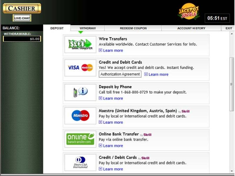 O Jackpot Jungle Casino é operado pela Real Time Gaming e seus jogos são oferecidos por meio de um software para download, bem como por uma plataforma de jogo instantâneo que permite jogar pelo navegador da web. Um site para dispositivos móveis também está disponível para quem deseja jogar em qualquer lugar.Outros jogos