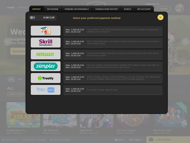 Bem, fiquei chocado com o cassino. Era uma porcaria, quase sem ganhos, mesmo com apostas pequenas de 40 centavos. Todos os caça-níqueis eram igualmente ruins, com pagamentos a partir de 100 euros, chat lento e sem boa vontade.