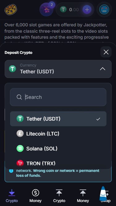 A carteira do cassino oferece opções para depositar e sacar criptomoedas, moedas fiduciárias ou trocar entre criptomoedas. ADA, BCH, BTC, DOGE, DOT, EOS, ETH, LTC, SOL, TON, TRX, TRY, USDC, USDT e XRP são algumas das moedas disponíveis para suas transações.