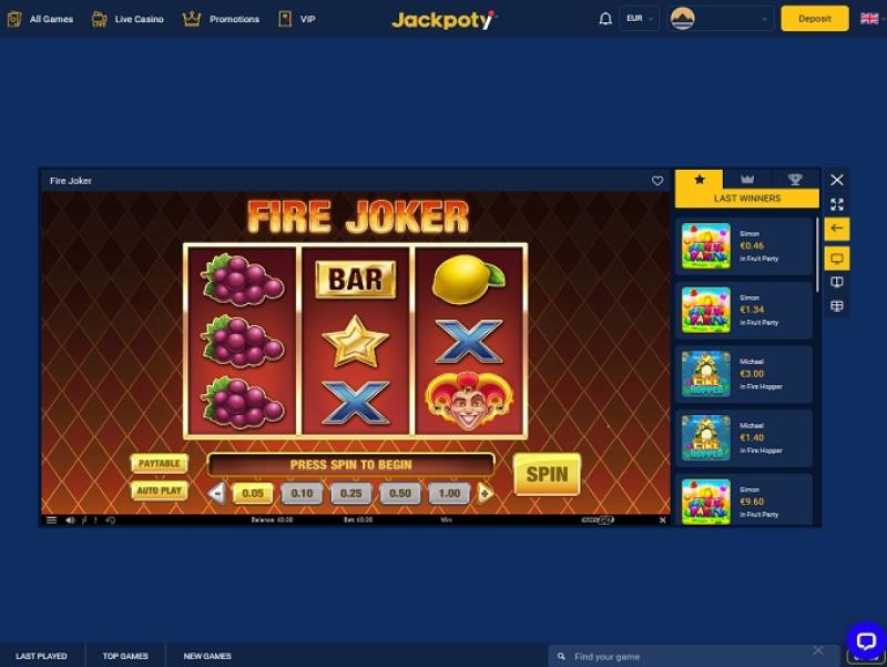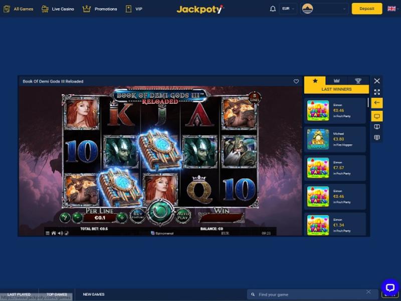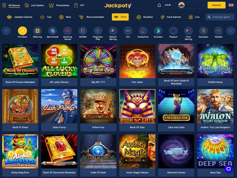 Aqui estão alguns dos jogos de caça-níqueis mais populares : Book Of Clovers Reloaded, All Lucky Clovers, Book Of Demi Gods III Reloaded, Book Of Cats, Avalon: The Lost Kingdom, Aloha King Elvis!, Book Of Diamonds Reloaded, Aztec Magic Deluxe, Deep Sea, Book Of Pyramids, Book Of Rampage Reloaded, Elvis Frog In Vegas, Fruit Million Easter Edition, Book Of Rebirth Reloaded, Book Of Tribes Reloaded, Book Of Xmas Reloaded, Book Of Champions Reloaded, Book Of Demi Gods II - Reloaded, Book Of Skulls Reloaded, Origins Of Lilith - 10 Lines, Origins Of Lilith - Expanded Edition, Book Of The Divine Reloaded, Lucky Lady Moon, Cash Truck, 88 Dragons Bounty, 20 Icy Fruits, 11 Enchanting Relics, Catch & Snatch, Lion Gems: Hold And Win, Warp Wreckers Power Glyph, Warp Wreckers Power Glyph, 7 Fortune Frenzy, Fruit Zen, Pirates Map, High Street Heist, Sakura Fortune 2, 25000 Talons, 9 Pots Of Gold HyperSpins, Amazing Link Fates, Cash 'N Riches Megaways, Lavish Joker, The Moneymania, Pearl Diver 2: Treasure Chest, Red Chilli Wins - 9 Lines, 3 Devils Pinball, 4 Diamond Blues - Megaways, Wolf Power: Hold And Win, 5 Star Knockout, 6 Tokens Of Gold... Lembre-se que esta é apenas uma pequena parte da enorme seção de caça-níqueis de vídeo disponível no Jackpoty Casino.