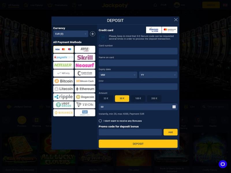 Como já mencionamos, a plataforma do cassino e o painel de controle do usuário são bastante intuitivos, portanto, realizar operações bancárias no Jackpoty Casino não deve ser nada complicado, principalmente porque os jogadores encontrarão a grande maioria das opções de pagamento populares, incluindo criptomoedas, cartões de crédito e débito, transferências bancárias instantâneas, carteiras eletrônicas…