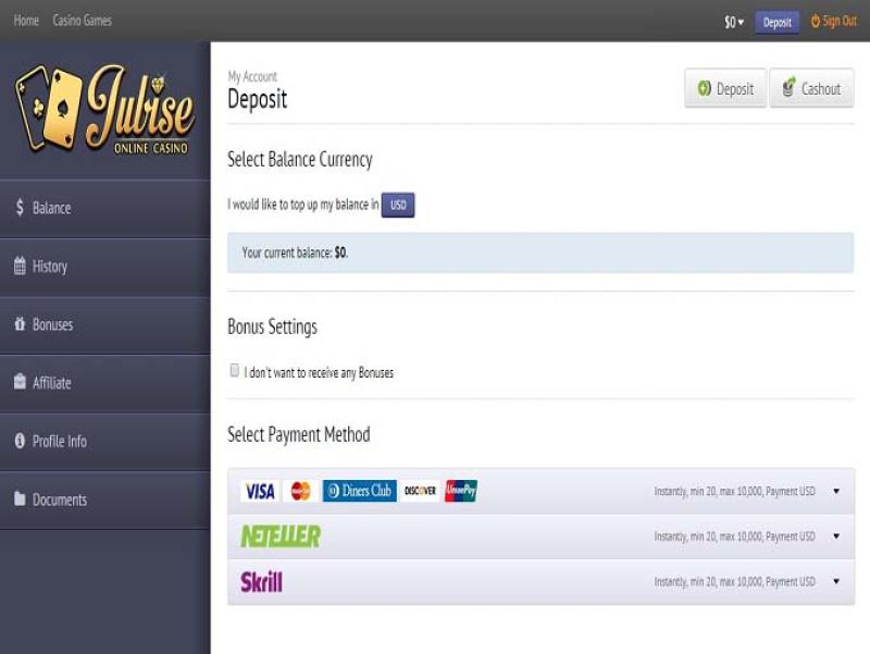 Testei recentemente o relativamente novo Jubise Casino; eles ofereceram um bônus grátis para novos clientes. Os caça-níqueis parecem um pouco datados em termos de gráficos, mas ainda são divertidos, mesmo que não sejam perfeitos. Os jogos são um pouco semelhantes aos caça-níqueis da Novomatic (Book of Ra, Lucky Lady Charm, etc.). O site está disponível em inglês e russo. Infelizmente, não tive muita sorte com o bônus grátis, mas ouvi de outras pessoas que conseguiram apostá-lo com sucesso. Além de caça-níqueis, também são oferecidos vídeo pôquer e roleta. Para quem deposita pela primeira vez, há um bônus de 150% de € 300. Há também um bônus para o segundo e terceiro depósitos, e promoções são frequentemente realizadas. As opções de depósito são suficientes e boas; você também pode depositar com Paysafecard, Visa, Mastercard, Neteller, Skrill/Moneybookers, UnionPay e Ukash (as duas últimas opções de depósito provavelmente não estão disponíveis na Alemanha). Só estou dando duas estrelas ao cassino porque não me convenceu completamente; outros cassinos têm caça-níqueis e promoções melhores. No entanto, para quem quer jogar caça-níqueis como os da Novomatic, este cassino é certamente interessante, então você deve depositar e testá-lo.