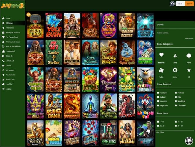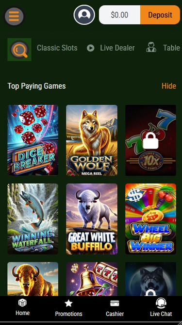 A biblioteca de slots utiliza a plataforma padrão da RTG, incluindo slots de vídeo clássicos e modernos. A biblioteca é bastante diversificada em termos de temas de jogos. Ela apresenta muitos jackpots progressivos e quase todos os jogos são compatíveis com dispositivos móveis.