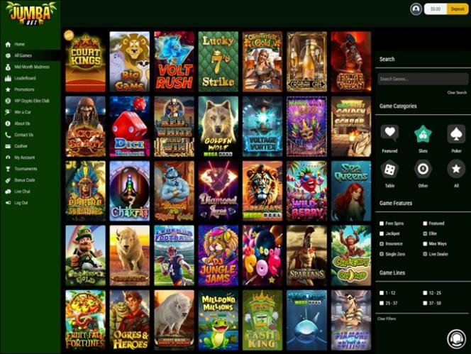 O Jumba Bet Casino oferece uma grande variedade de slots de vídeo e clássicos, embora não disponha de jackpots progressivos.