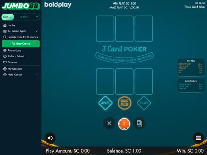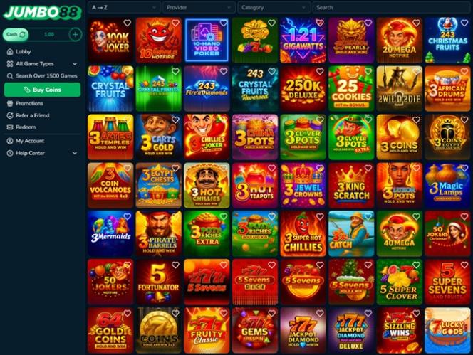 Há uma enorme variedade de jogos de cassino no Jumbo88, e você pode usar ambas as moedas para jogar. Seja girando os rolos das máquinas caça-níqueis, mergulhando em jogos de ritmo acelerado, participando de mesas com crupiês ao vivo ou desfrutando de jogos de mesa clássicos, sempre há algo divertido para experimentar.