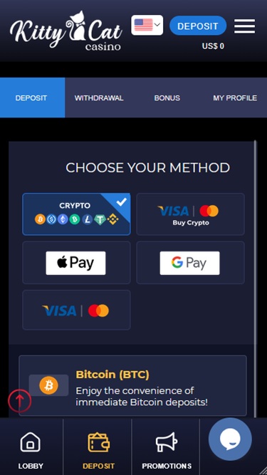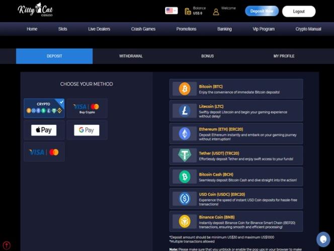 Se você não está muito familiarizado com depósitos em criptomoedas, certifique-se de consultar a seção Manual de Criptomoedas, onde todas as etapas desse processo são descritas e explicadas da melhor maneira possível para que você possa realizar transações com criptomoedas no Kitty Cat Casino sem esforço.