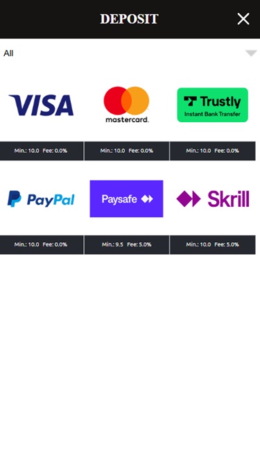 Nem todos os métodos de pagamento listados estão disponíveis em todos os países onde o cassino é aceito.