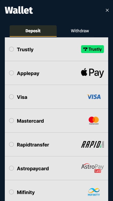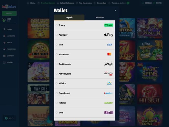 Clicar no botão de depósito ou saldo no menu à esquerda exibirá uma ampla variedade de métodos de pagamento disponíveis para os membros do cassino.