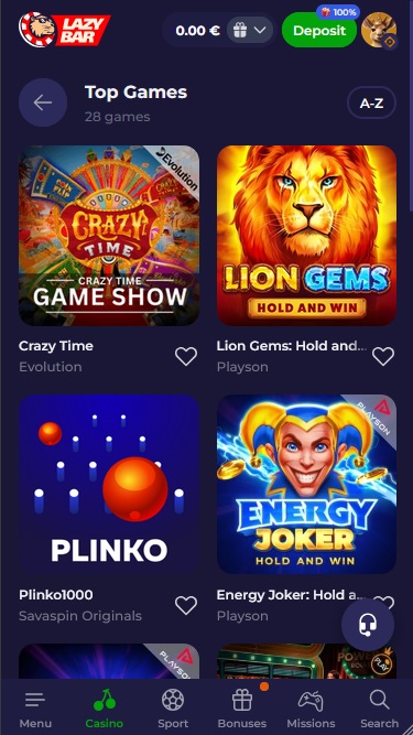 Além do design elegante e funcional, o Lazybar Casino oferece uma seleção incrivelmente vasta de jogos. O site conta com milhares de slots online, jogos com dealers ao vivo, jogos de mesa e lançamentos especiais. Vale ressaltar também que existem diversos jogos originais que você pode jogar exclusivamente aqui.