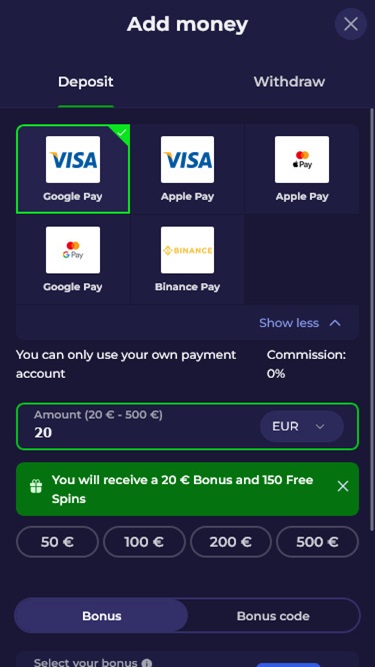 O Lazybar Casino permite que você deposite e saque fundos da sua conta usando diversos métodos de transação. Algumas opções incluem Visa , Mastercard , Transferência Bancária , Apple Pay , Google Pay , Skrill , Neteller , Paysafecard , Neosurf e MiFinity . Em relação às criptomoedas, a marca permite que os jogadores usem Bitcoin como sua principal opção de pagamento exclusivamente. Atualmente, nenhum outro método de criptomoeda está disponível.