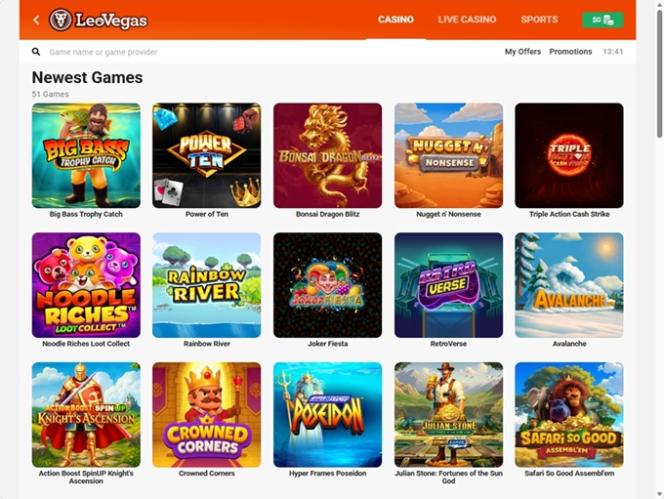O Leo Vegas é alimentado por Amaya, Microgaming, Net Entertainment, Playtech, BetSoft, Barcrest, Big Time Gaming, ELK Studios, Evolution Gaming, EYECON, Ezugi, Genesis Gaming, iSoftBet, lightningboxgames, Oryx, Play'n GO, playson, Quickspin, Rabcat, Relax Gaming, Thunderkick, Yggdrasil, Wazdan, Realistic Games, Pragmatic Play, Nolimit City, Felt Gaming, Red Tiger Gaming, IGT, Skillzzgaming, Fantasma Games, SYNOT Games, FUGA Gaming, Kalamba, Triple Edge Studios, Concept Gaming, Northern Lights Gaming, Stormcraft Studios, Cubeia, Electric Elephant Games, Pocket Games Soft, All41 Studios, Gluck Games, Gameburger Studios, Neon Valley Studios, Golden Rock Studios, SpinPlay Games, GONG Gaming, Blue Guru Games, BLOX, On Air Entertainment, Buck Stakes Entertainment, Games Global, 2by2 Gaming, Ash Gaming, Bally Technologies, Greentube, Merkur Gaming, NextGen, Odobo, Push Gaming, WMS, Genii, SG Interactive, Gamomat, Reel Time Gaming, Authentic Gaming, Iron Dog Studio, Old Skool Studios, Just For The Win, PearFiction Studios, Wild Streak Gaming, Slingshot Studios, Golden Hero, STHLM Gaming, 4ThePlayer, AvatarUX, Crazy Tooth Studio, High 5 Games, ReelPlay, Alchemy Gaming, Snowborn Games, Hacksaw Gaming, Max Win Gaming, Slotmill, SilverBack Gaming, Eurostar Studios, Lucksome Gaming and LeoVegas Studios , o que lhe confere uma enorme biblioteca de jogos acessível através de sua plataforma online. Um site totalmente móvel também está disponível para os apostadores que desejam jogar em um smartphone ou tablet.