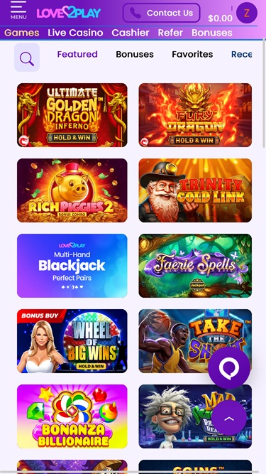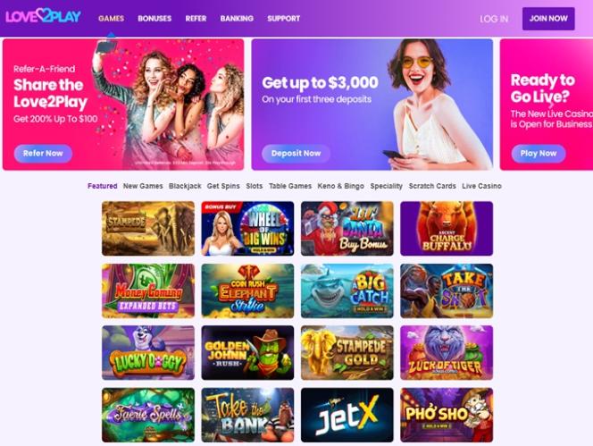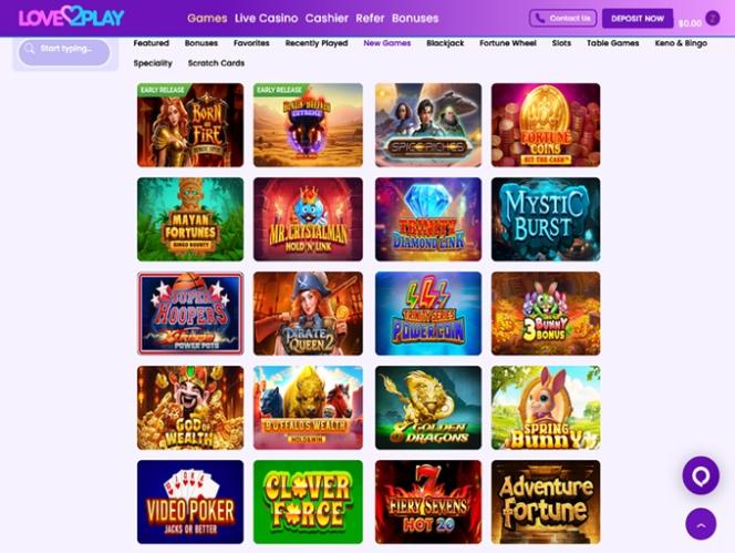 O lobby do Love2Play oferece categorias como Blackjack , Giros Grátis, Caça-níqueis, Jogos de Mesa, Keno e Bingo , Jogos Especiais, Raspadinhas e Cassino ao Vivo, o que é mais do que satisfatório, e jogadores de todos os níveis de habilidade e preferências poderão se divertir enquanto exploram as ofertas do cassino.