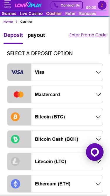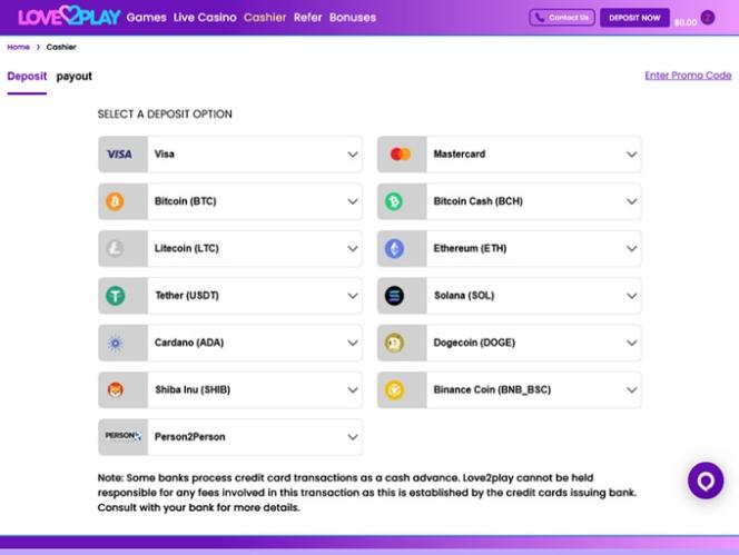 O Love2Play Casino aceita diversas criptomoedas populares, incluindo Cardano, Bitcoin, Bitcoin Cash, Dogecoin, Ethereum, Litecoin, Solana, Tether… Para depositar fundos nas contas dos jogadores, além das opções de criptomoedas , também é possível usar cartões de crédito e débito, transferências bancárias e outras opções.