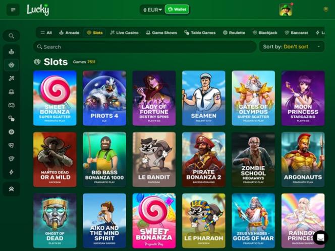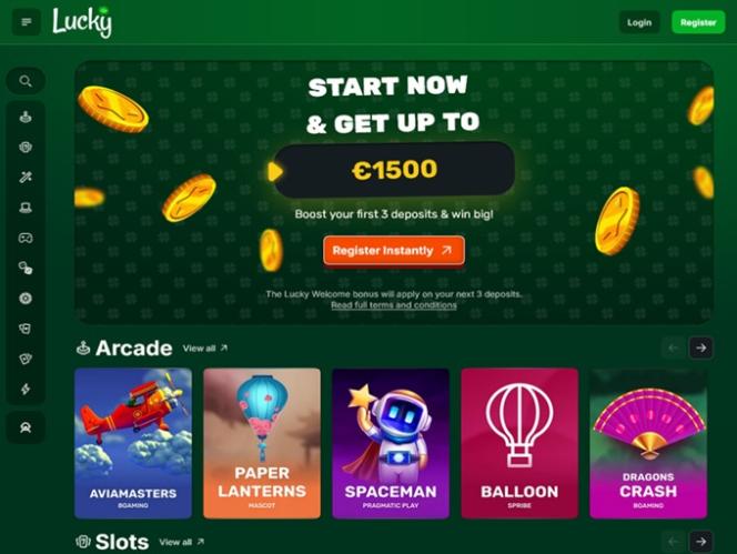 Lucky.co é um cassino online que convida jogadores do Canadá, Alemanha, Áustria, Irlanda e Nova Zelândia para o seu site, oferecendo uma seleção excepcional de jogos de cassino, incluindo caça-níqueis com dinheiro real, jogos com crupiês ao vivo, jogos de mesa e jogos de azar instantâneos. A marca oferece uma ampla gama de excelentes opções, e os jogadores também podem aproveitar um bônus de boas-vindas altamente recompensador e um programa de indicação.