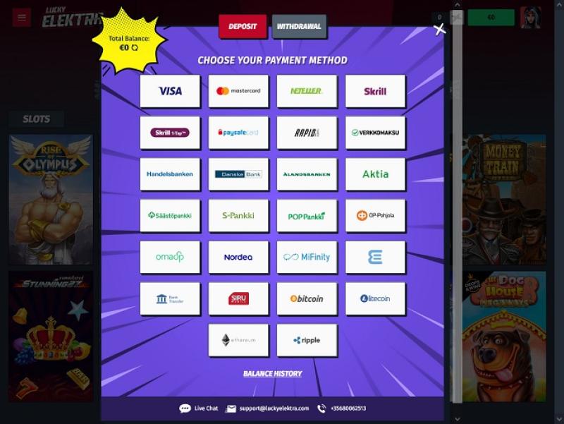 Confira as opções de pagamento do Lucky Elektra Casino: