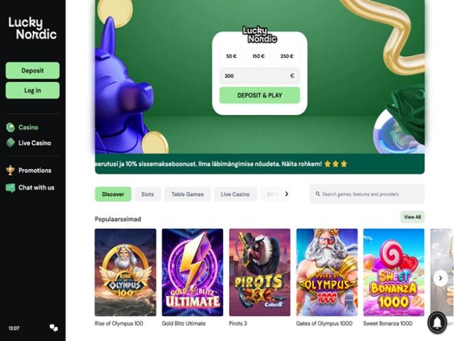 A Lucky Nordic é uma operadora de cassino online registrada sob a lei maltesa. Este site é licenciado e regulamentado pela Autoridade Tributária e Aduaneira da Estônia e é voltado principalmente para jogadores da Estônia e da Finlândia . A plataforma do cassino está disponível em inglês, estoniano e finlandês .