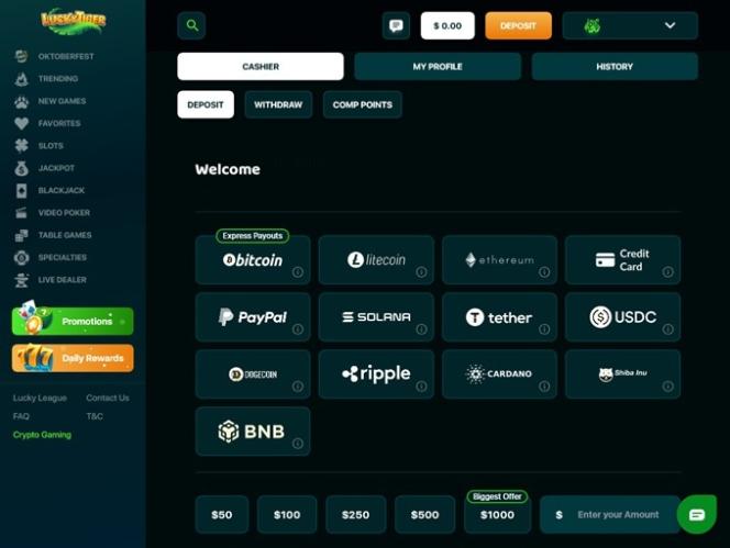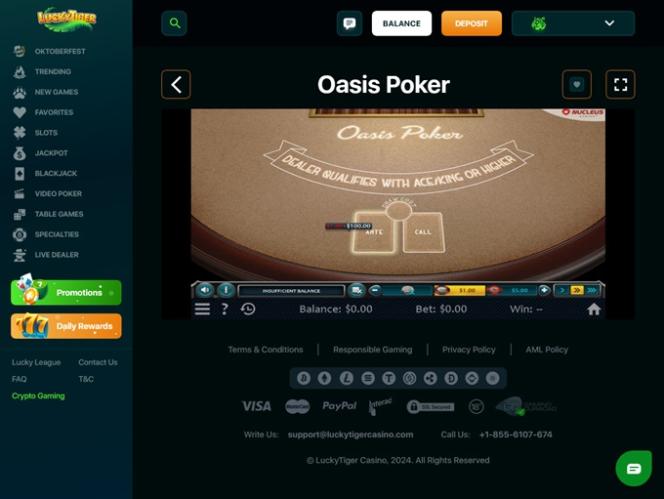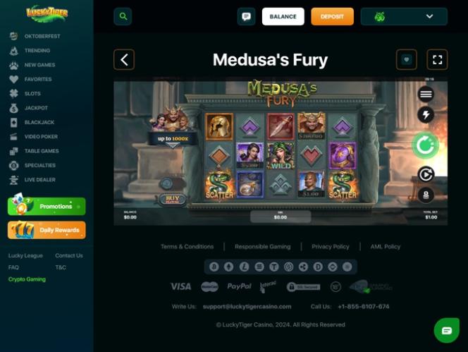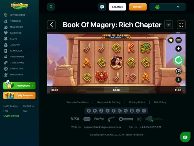 O Lucky Tiger Casino é um site de apostas online fundado em 2020. O cassino é um site irmão do Rich Palms e do Superior Casino, e atende aos mercados de jogos australiano e americano. Com um site belíssimo, o Lucky Tiger possui uma ótima biblioteca de jogos, um excelente programa de fidelidade e um histórico de pagamentos confiável. Tudo isso faz do Lucky Tiger Casino uma excelente opção para quem está em um desses dois países.Informações do cassino