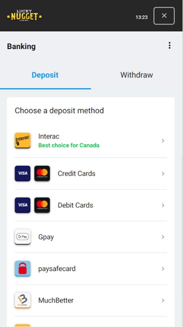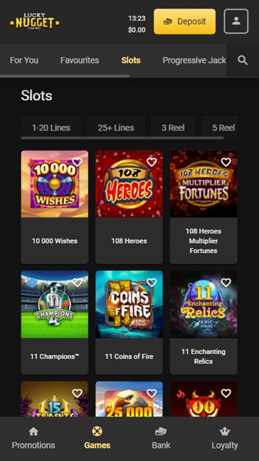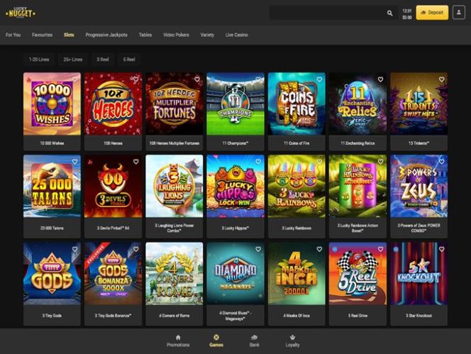 O Lucky Nugget Casino é alimentado por Microgaming, Net Entertainment, Evolution Gaming, Ezugi, Rabcat, Pragmatic Play, Red Tiger Gaming, Triple Edge Studios, Northern Lights Gaming, Stormcraft Studios, Switch Studios, Electric Elephant Games, All41 Studios, Gameburger Studios, Pulse 8 Studios, Neon Valley Studios, SpinPlay Games, Real Dealer Studios, GONG Gaming, On Air Entertainment, Buck Stakes Entertainment, Games Global, Old Skool Studios, Foxium, Just For The Win, PearFiction Studios, Wild Streak Gaming, Slingshot Studios, Fortune Factory Studios, Crazy Tooth Studio, Alchemy Gaming, Snowborn Games, Gold Coin Studios, Half Pixel Studios, Eurostar Studios, Aurum Signature Studios, Area Vegas, Wishbone Games, Circular Arrow, HammerTime Games, INO Games, Nailed It! Games, Neko Games and Oros Gaming , o que lhe confere uma biblioteca impressionante com centenas de jogos. O casino está disponível tanto para download como numa plataforma web de jogo instantâneo, que lhe permite jogar diretamente através do seu navegador. Existe também um site para dispositivos móveis para jogadores que desejam jogar em smartphones e tablets.