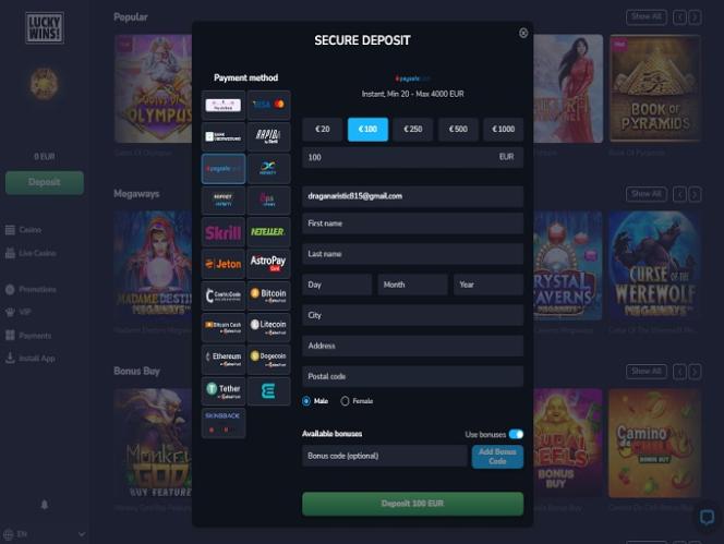 O LuckyWins Casino também oferece promoções e bônus muito tentadores, tanto para jogadores novos quanto para os já cadastrados. Os bônus de primeiro, segundo, terceiro e quarto depósitos, juntamente com o bônus de boas-vindas para grandes apostadores, certamente ajudarão você a começar com o pé direito. Para os jogadores já cadastrados, o cassino oferece diversas promoções sazonais que são renovadas periodicamente, mantendo a experiência sempre interessante para todos.