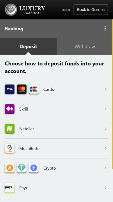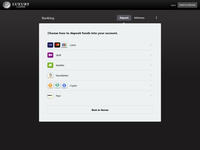 O sistema bancário do Luxury Casino é eficiente, oferecendo depósitos via cartão de crédito, cartão de débito, carteiras eletrônicas, transferências bancárias e Paysafecard. Os saques são processados por cheque, transferência bancária e carteiras eletrônicas. O tempo de processamento dos pagamentos varia de acordo com o método escolhido.