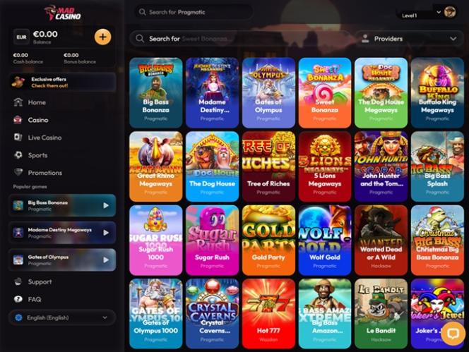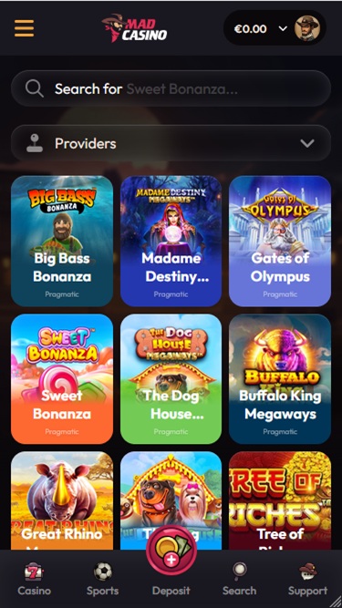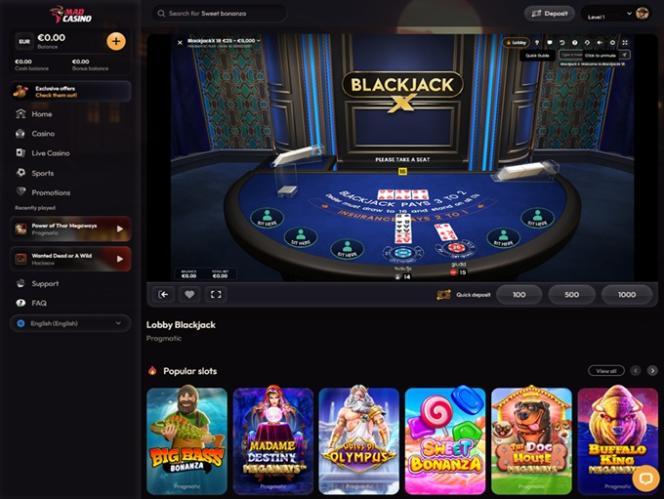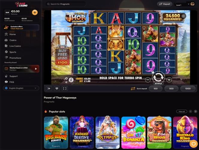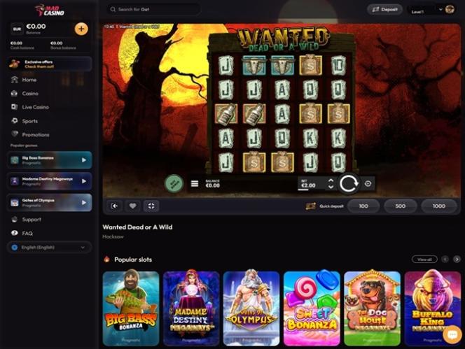 Recomendamos que você comece explorando a vasta seleção de slots com dinheiro real . O Mad Casino conseguiu reunir uma ampla variedade desses jogos populares, que irão satisfazer até mesmo os jogadores mais experientes, independentemente de suas preferências e gostos. Você pode jogar slots clássicos, os lançamentos mais recentes, Megaways, cluster pays, bônus buy-in e vários outros gêneros e subcategorias.