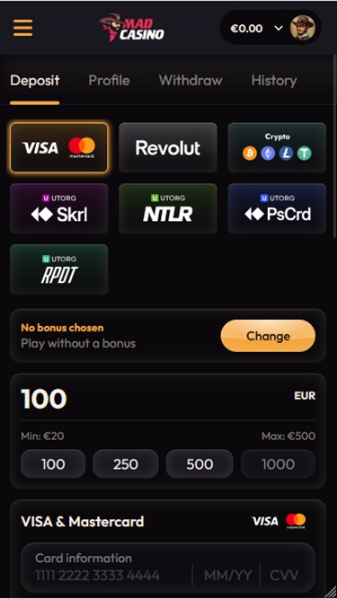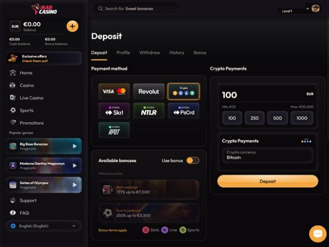 Embora não tenhamos informações precisas sobre benefícios de fidelidade ou um programa VIP, sabemos exatamente que tipo de promoções e bônus os jogadores podem esperar do Mad Casino, caso o escolham como seu site de jogos principal. Para começar, toda nova conta que se cadastrar no cassino poderá reivindicar um pacote de boas-vindas que inclui um bônus equivalente ao depósito, tanto para apostadores esportivos quanto para jogadores de cassino.